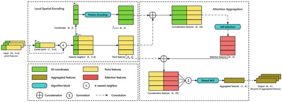 Figure 2 details the LAA module. It consists of two units: Local Spatial Encoding and Attention Aggregation. The former unit integrates each point’s positional context in relation to others, which enables the latter unit to consider spatial relationships among points during self-attention operations, rather than solely relying on feature similarity to calculate attention coefficients. The latter unit employs a self-attention mechanism to extract internal features from each block of the K-nearest-neighbor points. Unlike the LFA (Local Features Aggregation) module introduced by Hu [29], we have replaced its Attentive Pooling unit with our Attention Aggregation unit, as shown on the right side of Figure 2. The equations used in this module are represented as follows: