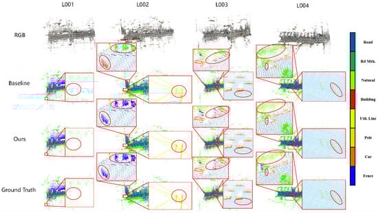 It should be noted that our rigorous replication of RandLA-Net’s experiment yielded a lower mIoU value (76.64%) than the authors’ reported figures (81.77%). Despite ensuring consistency in parameter settings according to the original study, discrepancies likely arose due to variations in experimental conditions. In our replication of RandLA-Net, employing the density-based grid decimation method, we realized enhanced outcomes as well, with an increase in performance from 76.64% to 81.55%. As shown in Figure 5, L001 demonstrates the strong segmentation performance of our method on edge points, while L002 highlights its effectiveness in segmenting pole point clouds. Additionally, L003 and L004 illustrate the method’s ability to accurately identify ground marks.