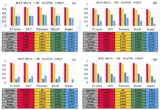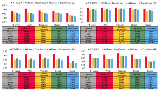 - The ablation experiment validated the effectiveness of each module. The XGBoost component explicitly captures nonlinear feature interactions using decision trees, while the Transformer feedforward network captures nonlinear spatial features and implicitly models complex relationships. The SECA mechanism integrates features through dynamic pooling and convolution, enhancing the model’s ability to leverage both explicit and implicit nonlinear features. Taking the precision metric in the Futian District as an example, XT-SECA outperformed XGBoost + Transformer, XGBoost, and Transformer by 8.5%, 4.7%, and 7.9%, respectively. In the Luohu District, the improvements were 5.7%, 4.3%, and 5.9%; in the Nanshan District, they were 3.7%, 3.5%, and 4.2%, respectively. In terms of time, XT-SECA reduced processing duration from 65.34 s, 65.47 s, and 66.82 s in Futian, Luohu, and Nanshan, respectively, to 11.81 s, 11.83 s, and 12.07 s.