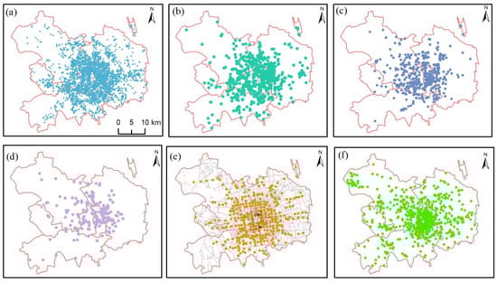 The spatial distribution of the six types of facilities in the Beijing urban area. The points in different colors represent different facility POI: (a) 2-star; (b) 3-star; (c) 4-star; (d) 5-star; (e) Transport facilities; (f) Tourist attractions.