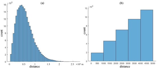 The spatial distribution of distances between (a) all pairs of data points and (b) point distances less than 5000 m.