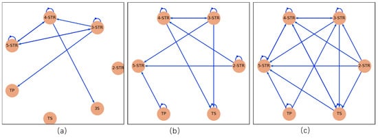 Symmetrical and asymmetrical dependence relationship among diverse facilities across different fuzzy neighborhoods: (a) 500–1000 m; (b) 1000–2000 m; (c) 2000–5000 m. Circles represent six types of facilities. Unidirectional line segments indicate an asymmetric relationship from facility A to facility B, while bidirectional line segments signify a symmetric attraction between A and B. A line segment pointing back to the same facility denotes an autocorrelation relationship.