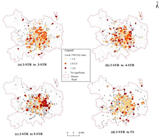 Finally, the statistical results of local value are summarized in Table 6, which illustrates the number of local values greater than 1 and exhibiting significance for “5-STR to TP” and “5-STR to TS” under the fuzzy bandwidth [1000 m, 2000 m] for FGWCLQ, as well as under a bandwidth of 1500 m for GWCLQ. Notably, FGWCLQ shows higher local clusters when fuzzy neighborhoods are considered.