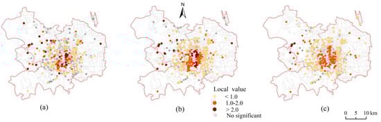 The distribution of local value between 4-STR hotels and TS across different fuzzy neighborhoods: (a) 500–1000 m; (b) 1000–2000 m; (c) 2000–5000 m.