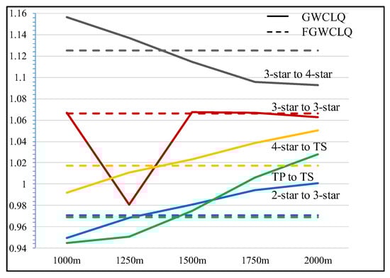 First, the global FGWCLQ results reveal distinct spatial association relationships of star hotels across three fuzzy neighborhoods (shaded areas). Intra-category autocorrelation (main diagonal values) indicates that high-star hotels cluster significantly (autocorrelation >1), with clustering intensity diminishing as neighborhood scale increases. Specifically, 5-STR hotels exhibit the strongest clustering across all scales, peaking at the 1000-m radius (highest CLQ value). In contrast, 2-STR hotels display random distribution at all scales, likely due to their high numbers and dispersion, creating service gaps in suburban tourism zones. Beyond intra-category dynamics, inter-category associations strengthen with increasing neighborhood scale, peaking at 2000 m—indicating mixed star-rated clusters function as “hierarchical service systems” (e.g., 3-STR complementing 5-STR by catering to extended stays). A critical observation is that star hotels show stronger associations with tourist attractions (TS) than with transportation facilities (shown in the last two columns of Table 4), with this gap widening at larger scales, highlighting attraction proximity as a primary locational driver over mere transit access. These findings confirm that high-star hotels in Beijing’s core cluster are more intense than lower-star types, with diverse hotels aggregating around high-star establishments—disproportionately proximate to tourist attractions—underscoring their role as spatial anchors for star-rated hotel distribution []. Consequently, upgrade infrastructure within 1000 m of 5-STR clusters to reinforce agglomeration, incentivize 2-STR development near suburban transit/attractions to fill gaps, zone 2000 m mixed-star corridors for complementarity, and strengthen attraction-hotel connectivity via scale-appropriate infrastructure. These optimize tourism resource allocation using high-star hotels as anchors.