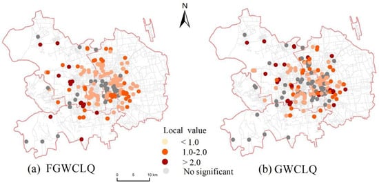 To demonstrate the superior performance of FGWCLQ, this section compares it with deterministic methods in both global and local versions. Geographically Weighted Colocation Quotient (GWCLQ) is a typical deterministic method that uses a single threshold to define the spatial neighborhood []. For comparability, the GWCLQ employed a bandwidth of 1500 m, while the FGWCLQ method utilized a fuzzy neighborhood of 1000–2000 m. Both methods used the same parameters (sample size = 1000 and random iterations = 1000). The results are presented in Table 5 and Figure 6.