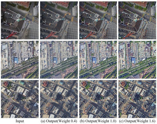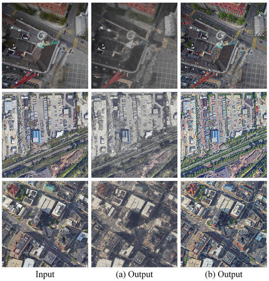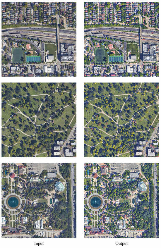 As shown in Figure 8, we used remote sensing images under different scenes as input, and the generated stylized images still maintain the semantic content of the original images while effectively reflecting the cartoon style. Although the cartoon style transfer method proposed in this paper can achieve high-quality results on both photorealistic 3D scenes and remote-sensing imagery, there are still the following shortcomings: