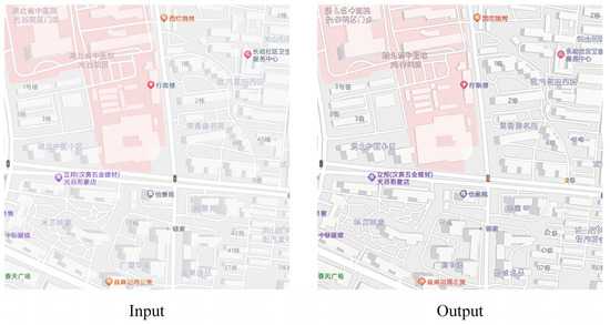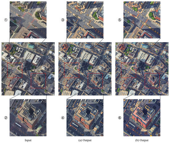 - Although this method performs excellently when processing high-resolution remote-sensing imagery from Google Earth and preprocessed 1024 × 1024 oblique photogrammetry tiles, its application on standard maps is not ideal. As shown in Figure 9, the core advantage of our framework lies in the cartoon-style simplification of texture-rich real-world scenes. When the input is standard map data, which are already highly abstract and symbolic, the model has difficulty performing effective secondary simplification. The generated results tend to remain at a superficial level of color enhancement and edge tracing, rather than producing creative style transfer. This indicates that future work requires the model to be able to intelligently identify different data types and adopt differentiated stylization strategies.