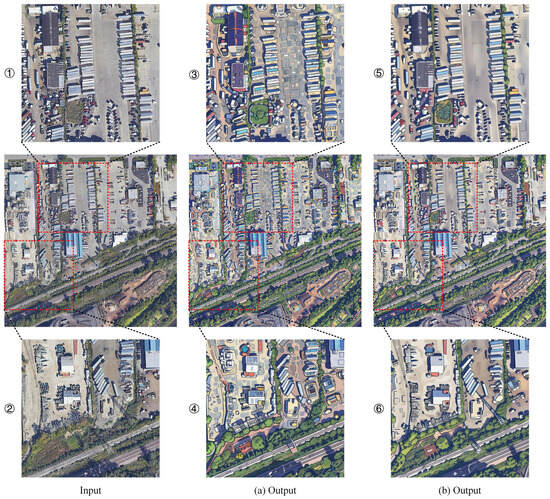 The initial noise image obtained through DDIM Inversion is more stable in preserving the semantic information of the input image compared to random initial noise images. As shown in Figure 6, the noise image obtained after DDIM Inversion serves as a better starting point for the sampling process that is more conducive to restoring the structure and details of input image. In the comparison, we can observe that image ⑤ is more precise in the reconstruction of open spaces and ground features. In image ③, the open spaces contain a large number of details that are not from the input image, and the re-rendering of containers and vehicles on the ground is excessive, resulting in an overall chaotic appearance. In contrast, image ⑤ is able to restore the various ground features in the input image with high quality, providing better visual quality. Similarly, in image ④, the elements on the ground have undergone significant changes, with there being many details that do not exist in the input image, which makes the image overall appear disordered. In image ⑥, the distinction between ground features is more pronounced, and the semantic content of the input image is more accurately restored, which results in a more fluid and harmonious overall image.