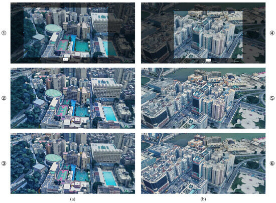 This framework is designed to process high-resolution geospatial imagery. To conduct comprehensive testing and validation, we developed a dataset comprising 60 images from diverse scenarios. The imagery originates from Google Earth, covering various landforms including landscapes, buildings, wastelands, and forests. The remote-sensing images span from 16 to 18 resolution levels to ensure rich detail and texture. For oblique photography data, we performed standardized preprocessing by uniformly cropping them into 1024 × 1024 pixel blocks to obtain standard input for the model.
