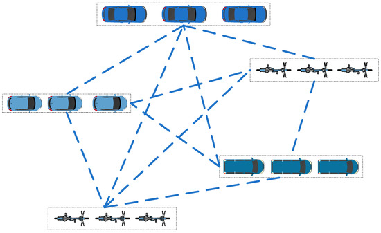 In urban transportation systems, the trajectory behaviors of different travel modes form dynamic interaction relationships through spatiotemporal coupling and correlation mechanisms [36,37]. For dynamic travel scenarios (e.g., taxis and bike-sharing), as illustrated in Figure 1, trajectory interactions can be modeled using a graph structure . Here, the node set represents the feature vector set of complete vehicle trajectories; each edge in the edge set captures the interactive influence between two trajectories. The adjacency matrix encodes the pairwise relationships, where each element denotes the OD (origin–destination) distance between the trajectories of vehicle and vehicle . The edge weight is defined by the following function (3):