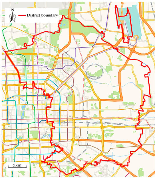 To validate the effectiveness of the proposed method across multimodal travel mode scenarios, we selected Beijing’s Chaoyang district as our study area (with an area of 470.8 square kilometers and a resident population of 3.452 million), as shown in Figure 2. It includes complex traffic environments, from the Central Business District to the Olympic zone, and exhibits typical characteristics of a multimodal transportation system.