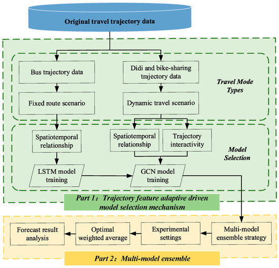 Urban multimodal travel trajectory prediction is a core challenge in Intelligent Transportation Systems (ITSs). It requires modeling both spatiotemporal dependencies and dynamic interactions among different travel modes such as taxi, bike-sharing, and buses. To address the limitations of existing methods in capturing these diverse trajectory characteristics, we propose a spatiotemporal multi-model ensemble framework, which is an ensemble model called GLEN (GCN and LSTM Ensemble Network). Firstly, the trajectory feature adaptive driven model selection mechanism classifies trajectories into dynamic travel and fixed-route scenarios. Secondly, we use a Graph Convolutional Network (GCN) to capture dynamic travel patterns and Long Short-Term Memory (LSTM) network to model fixed-route patterns. Subsequently the outputs of these models are dynamically weighted, integrated, and fused over a spatiotemporal grid to produce accurate forecasts of urban total traffic flow at multiple future time steps. Finally, experimental validation using Beijing’s Chaoyang district datasets demonstrates that our framework effectively captures spatiotemporal and interactive characteristics between multimodal travel trajectories and outperforms mainstream baselines, thereby offering robust support for urban traffic management and planning.