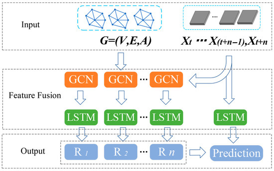 To this end, ensemble methods that select appropriate models for processing temporal and spatial features separately have been developed. Liu et al. [25] improved prediction accuracy by introducing a CNN to extract spatial information and combining it with LSTM. However, since the Convolutional Neural Network (CNN) [26,27] is based on a regular grid structure, it faces inherent limitations in dealing with complex graph topological relationships in the traffic network (such as the connectivity of intersections and the non-uniform distribution of road sections), and cannot capture the spatial characteristics of traffic trajectories inherently. In this regard, a Graph Convolutional Network (GCN) handle complex interaction network relationships well [28,29]. Zhao et al. [30] proposed T-GCN, which integrates the GCN and GRU models to better handle spatiotemporal dependencies in traffic networks. Considering the impact of external conditions, Liu et al. [31] proposed an STAEformer model, significantly improving the prediction capability of traffic trajectory. Patara T et al. [32] introduces the Spatiotemporal Graph Neural Controlled Differential Equation (STG-NCDE) method, which combines temporal and spatial processing using neural controlled differential equations to achieve superior accuracy in traffic forecasting compared to 20 baseline models. Choi et al. [33] proposes the DF-TAR network, which combines dangerous driving statistics with external environmental factors to improve traffic accident risk prediction accuracy compared to the benchmark model. Wang et al. [34] developed an integrated prediction model based on an attentional mechanism and a 1DCNN-LSTM network, which combines the strengths of two models with excellent prediction results but does not consider the interactions between their transportation modes. Wen et al. [35] proposed a decomposition dynamic graph convolutional recurrent network (DDGCRN) for traffic flow prediction. This method combines dynamic graph generation based on an RNN, which can capture the spatial and temporal characteristics of time changes, and uses data-driven modeling to improve prediction performance.