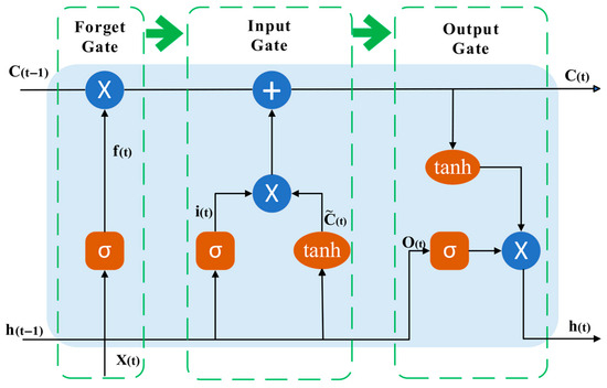 where , , and represent the input gate, forget gate, and output gate of the LSTM, respectively. represents the concatenation of the previous hidden state and the current input . and are the cell states at time and , respectively, while represents the candidate cell state. denotes the weights and represents the learnable parameters. and are the activation functions.