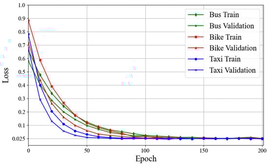 During training, the training EPOCH for both models is set to 200. The training results are shown in Figure 6. The taxi prediction model stabilizes after 80 EPOCHs, while the prediction models for shared bicycles and buses gradually converge after 120 EPOCHs. The loss for these three models decreases continuously in both the training and validation sets as EPOCH increases and approaches convergence, indicating that the model’s prediction performance has met expectations.