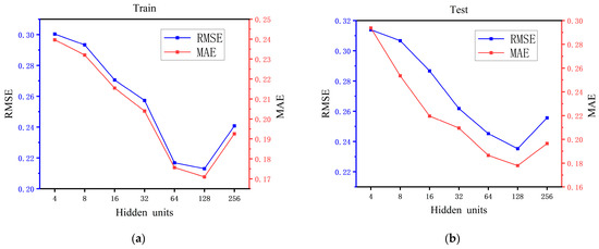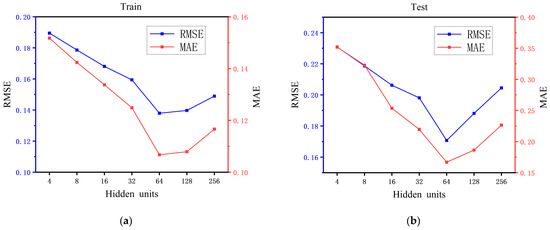 Comparison of prediction performance between the training and test sets with different hidden units based on the bike-sharing trajectory dataset. (a) Variation in RMSE and MAE in the training set. (b) Variation in RMSE and MAE in the test set.