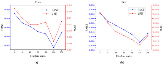 Comparison of prediction performance between the training and test sets with different hidden units based on the taxi trajectory dataset. (a) Variation in RMSE and MAE in the training set. (b) Variation in RMSE and MAE in the test set.