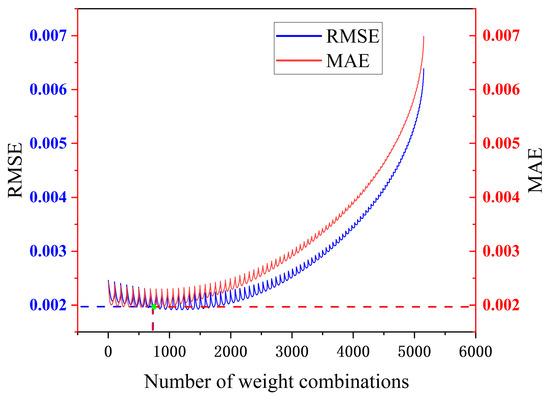 In all possible combinations of weights, we used RMSE and MAE as evaluation metrics to assess the prediction performance after weighted averaging. The weight combinations were calculated using Equation (14), and the possible combinations totaled 5151.