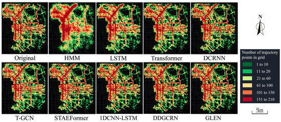 Further analysis reveals the following points: First, deep learning-based methods (including LSTM, Transformer, DCRNN, T-GCN, STAEFormer, 1DCNN-LSTM, DDGCRN, and GLEN) perform significantly better than the traditional HMM method, indicating that deep learning-based approaches are better at capturing nonlinear relationships. Second, spatiotemporal deep learning methods (including DCRNN, T-GCN, STAEFormer, 1DCNN-LSTM, DDGCRN, and GLEN) outperform Transformer and LSTM, highlighting the effectiveness of both temporal and spatial features in traffic trajectory prediction. Third, the GLEN, which models trajectory interactions between multimodal travel modes, performs better than STAEFormer, DCRNN, 1DCNN-LSTM, DDGCRN, and T-GCN. This indicates that constructing trajectory interaction between various transportation modes can more effectively simulate the interactions of traffic trajectories within the travel network.