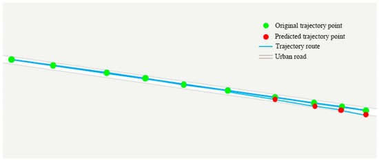 We performed a visual analysis on the test samples from the trajectory dataset to demonstrate the prediction performance of the proposed multi-model ensemble method. Figure 12 presents the prediction results for a real trajectory from the test data, focusing on the last four trajectory points of this segment. From the results, it is evident that the predicted values are very close to the actual trajectory points, reflecting the strong predictive capability of the method for travel trajectories. However, as the prediction length increases, the deviation from the actual travel trajectory becomes more noticeable. The green points represent the original trajectory points, while the red points represent the predicted trajectory points for the next one to four time steps.