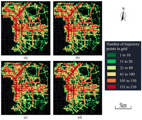 To provide a more comprehensive analysis and prediction of the changes in urban traffic trajectories, we visualized the trajectory points for the three types of transportation modes. As shown in Figure 13, the original trajectory points appear in several key areas, including hotspot commercial and park areas (e.g., Guomao CBD, Chaoyang Park, and Dongba Park), major traffic arteries (e.g., Jingtong Expressway, Chaoyang Road, and the East Third Ring Road), and transportation hubs (e.g., Sanyuanqiao Subway Station and Beijing Chaoyang Station). These areas usually become traffic hotspots due to the large flow of people, indicating that they may face greater traffic pressure. Figure 14a–d show the original trajectory route and the traffic trajectory trend of the next one to four time steps (each time step is 15 min). Through visual analysis, we can accurately identify the streets and areas where traffic congestion may occur in Chaoyang District in the future, and provide support for urban traffic management departments to take corresponding diversion measures in advance.