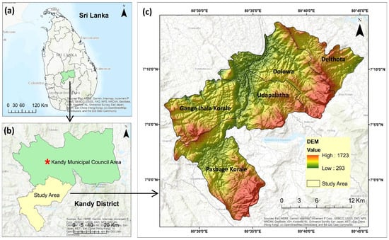 Study area. (a) Map of Sri Lanka showing Kandy District; (b) map of Kandy District showing the study area; and (c) DEM map of the study area with five DSDs.