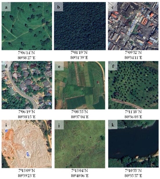 Land use/cover (LULC) sample images with location information: (a) tea (T), (b) forest (F), (c) built-up area (B), (d–f) home garden and other crops (H), (i,j) grass and bare land (G), and (k) Water Body (W).