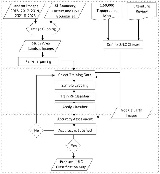 In this study, three key steps were carried out for the RF classification, as illustrated in Figure 3. As the initial step, relevant datasets were prepared by clipping the Landsat imagery to the study area, while the land use/land cover (LULC) classes were defined using 1:50,000 topographic analog maps and a review of the existing literature. Subsequently, training samples representing the major LULC categories were manually selected based on visual interpretation of Google Earth imagery. To enhance spatial detail and ensure accurate class representation, a pan-sharpening technique was applied during this stage. Each training sample was then assigned a corresponding LULC class label to prepare the dataset for supervised classification. The RF model was trained using the labeled samples, with two key parameters configured, as follows: the number of decision trees was set to 50, and the maximum tree depth to 30, in accordance with the default settings in ArcGIS 10.8.1. The trained model was then applied to the full image to produce the final LULC classification map. Finally, for the accuracy assessment, a stratified random sampling approach was employed, generating 200 validation points per year to ensure adequate representation of all LULC types. Google Earth imagery was used as reference data for validation, following established methodologies in previous studies [,]. This integrated approach contributed to ensuring the reliability and consistency of the classification outputs across all time periods.