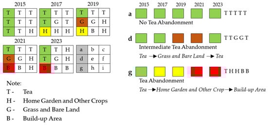 The method for calculating LULC trajectory is shown in Figure 4, which is modified from [] to illustrate arbitrary LULC trajectories. Taking three pixels, labeled ‘a,’ ‘d,’ and ‘g,’ as an example, the trajectories are observed from 2015 to 2023, with data collected every other year. Pixel ‘a’ is identified as an area with no tea abandonment during the entire period. However, the area of pixel ‘d’ undergoes conversion to grass and bare land and ultimately returns to tea cultivation. The area of pixel ‘g’ exhibits abandonment after 2017, transitioning first into a home garden and other crops, subsequently converting to a built-up area, and the length of abandonment for pixel ‘g’ is 7 years.