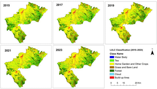 Land use/cover (LULC) changes in the study area (2015, 2017, 2019, 2021, and 2023).