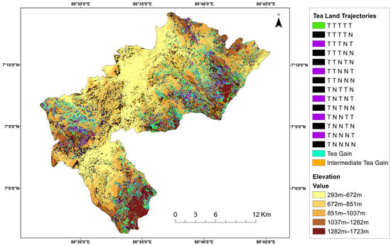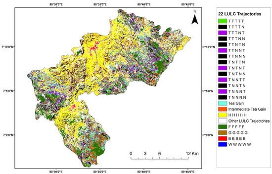 According to Wang et al. [], trajectories in a time series can be represented by trajectory codes, taking various forms such as numbers or letters, for each pixel in a raster image. Hence, in this study, the initial letter of the LULC class (Table 4) was employed as trajectory codes to identify the trajectories for each pixel across the five temporal periods of 2015, 2017, 2019, 2021, and 2023. Codes like T T T T T, H H H H H, and so forth, with the same code for each time slice, denote trajectories with no LULC changes. On the other hand, codes like T T H H B, T G G G G, and F F H H H indicate a change in land cover during a specific period. For example, T T H H H signifies the transition from tea (T) to home garden and other crops (H) after 2019. Assigning a set of rational rules depending on each study is crucial in trajectory analysis to generate meaningful maps, as emphasized in previous studies [,]. Consequently, the subsequent two steps were executed to formulate trajectory maps adhering to a set of rational rules:
