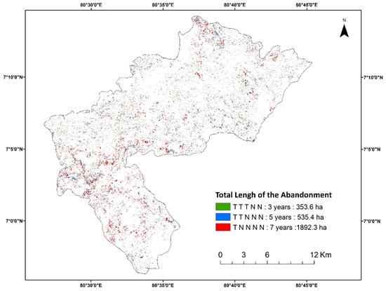 The high accuracy of the abandonment map, as demonstrated by the validation results, provides a solid foundation for further analysis of tea land abandonment patterns. Figure 9 illustrates distinct categories of tea land abandonment, varying in length from 3 to 5 to 7 continuous years. Notably, the results indicate that the area of tea land abandonment for a continuous period of 7 years was the largest, accounting for 35% of the total abandonment areas, equivalent to 1892.3 ha. In contrast, the period of 5 years and 3 years accounted for 535.4 ha and 353.6 ha, respectively. This finding indicates a significant and prolonged trend of tea land abandonment within the study area. Furthermore, the spatial distribution map reveals that during these 7 years, tea land abandonment occurred extensively across the entire study area, indicating the widespread nature of this phenomenon.