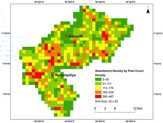 The study also used grid-based density analysis to identify the characteristics of spatial distribution of abandoned tea lands. This analysis is commonly used to understand the spatial variation in features, identify hotspots, or quantify the intensity of certain phenomena across a landscape. Previous studies have explored various grid sizes, also known as window size utilization, primarily in Land Surface Temperature (LST) studies [,]. However, in LULC-based studies, a common practice is to employ a 1 km2 ground cover for analysis [,]. Therefore, for this analysis, a grid size of 990 m × 990 m (33 × 33 pixels) was chosen to cover approximately 1 km2 of ground area without dividing the pixels.