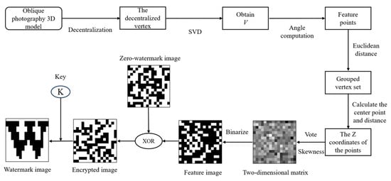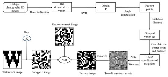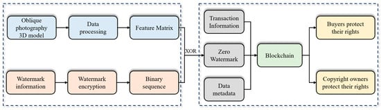 The scheme consists of three main phases. First, the oblique-photography 3D model data undergoes processing to generate watermark information, for which a zero-watermark is constructed using an XOR operation with an encrypted binary watermark []. Second, the zero-watermark identifier, transaction information, and data metadata are collectively stored on the blockchain. Leveraging the blockchain’s immutability and decentralized nature, this ensures the integrity and security of transaction-related information. Finally, both the copyright holder and the buyer can verify the authenticity and integrity of the model data by accessing the blockchain-stored information, thereby safeguarding their respective rights and interests.