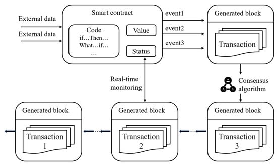 Once a transaction is verified as legitimate, it is packaged into a new data block, which is subsequently authenticated through the blockchain’s consensus mechanism and appended to the main chain. Throughout the entire process, the blockchain continuously monitors the contract’s status and value in real time, ensuring transparency, security, and immutability [,].