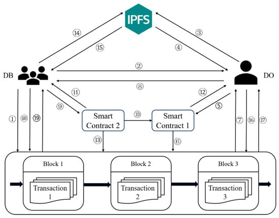 Other research has introduced image copyright-protection frameworks that combine blockchain and zero-watermarking technology. These frameworks incorporate keyword search functionalities for images stored in the system, using Ethereum smart contracts while mitigating blockchain data expansion issues through IPFS, thereby achieving copyright traceability []. Furthermore, a multi-type decentralized data transaction scheme has been proposed that would integrate smart contracts with digital watermarking technology. By utilizing zero-watermark technology, the scheme ensures copyright protection during data sharing, while transaction-specific algorithms and protocols implemented through smart contracts guarantee fairness in data transactions [].