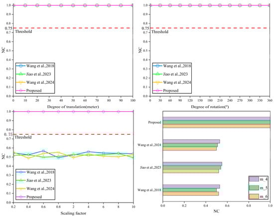 As can be seen in Table 1, the NC values of the cross-validated watermark information all failed to reach the set NC threshold, and the valid watermark information could not be identified. The NC value of the watermark information verified by the same data was 1, indicating that the zero-watermark method in this paper has strong uniqueness and can well distinguish different oblique-photography 3D model data.