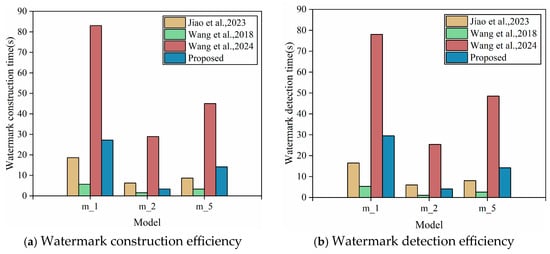 To evaluate the practical applicability of the proposed watermarking scheme, its computational efficiency must be assessed, particularly in terms of watermark construction and detection time. Therefore, using Models m_1, m_2, and m_5 as examples, we designed an experiment to measure and compare the time consumption of the construction and detection processes. We compare the time required for the proposed scheme with the times required by three existing methods. The experimental results are summarized in Figure 9.