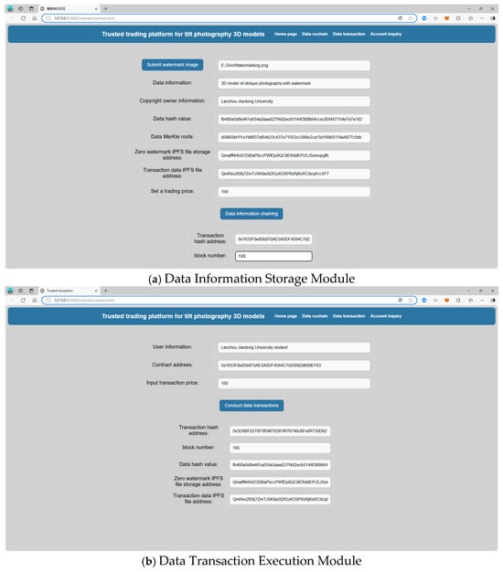 Based on the approach proposed in Section 3, this paper implements a trusted-transaction system for oblique-photography 3D models, utilizing the Ethereum blockchain as the underlying platform. The implementation process includes the writing and deployment of smart contracts as well as the development of the front-end system. Firstly, the smart contract is written using the Solidity language within the Remix IDE. Secondly, the smart contract is deployed to the Ethereum network. MetaMask (Ethereum wallet) serves as a bridge between the front end and the blockchain during the deployment process. When deploying the contract, MetaMask uses the user’s private key to digitally sign the transaction and pay the “gas” fees. Upon successful deployment, the contract code is submitted to the Ethereum blockchain, and the corresponding contract address is generated. Finally, the user interaction interface is developed using a front-end framework, enabling users to seamlessly conduct data transactions, view transaction records, and verify attestation information through the system.