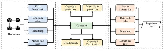 Recent research has explored the integration of blockchain technology with digital watermarking technology, aiming to enhance trust in data transactions. By embedding copyright information into carrier data and recording it on the blockchain alongside transactional details, this approach ensures the traceability of data sources and verification of ownership. Some studies have focused on the development of blockchain-based digital watermarking algorithms to strengthen copyright protection. For example, a zero-watermark registration scheme integrating Hyperledger Fabric and the InterPlanetary File System (IPFS) has been proposed to securely register watermarks and their associated parameters while enabling lossless copyright protection for high-resolution remote sensing images [].