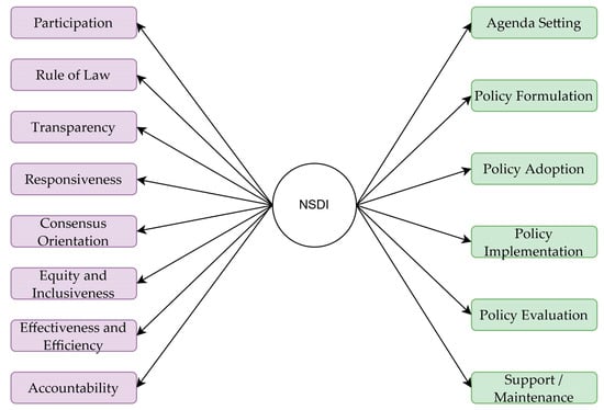 The conceptual framework of the paper consists of the dual-theoretical approach whereby the good governance principles, which are propounded by the United Nations Economic and Social Commission for Asia and the Pacific (UNESCAP), and the Policy Cycle Model advocated by the European Geosciences Union (EGU) are integrated. NSDI is envisioned as a socio-technical solution including legal protocols, institutional arrangements, standards, and digital infrastructure to collect, manage, distribute, and utilise spatial information. According to the framework, it is assumed that:
