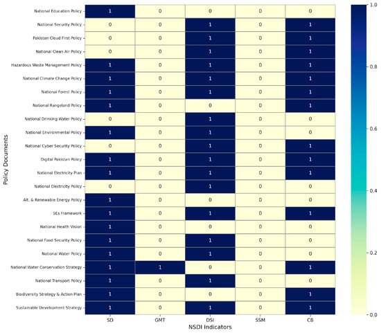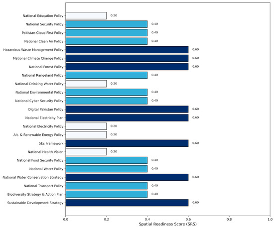 The SRS provides a composite index that quantifies the overall alignment of each policy document with NSDI principles. It transforms binary-coded indicators into a continuous score (0–1), enabling comparative ranking and aggregation across documents. This quantitative simplification highlights strengths and gaps in NSDI readiness and supports longitudinal or cross-country benchmarking. As an example, the National Climate Change Policy states “Promote the use of GIS/RS-based studies to assess and quantify past temporal trends and monitor future changes in snow cover, glacial volume, glacial lake formation and burst, deforestation, land degradation (salinity, water logging), soil erosion, inundation of Indus deltaic region and other coastal areas”. This was coded as “1” for the “Formulation” and “Implementation” stages of the policy cycle, as it not only guides the design of strategies, but also helps in terms of oversight during implementation. Regarding the governance principles, this text was coded as ‘1’ for the “effectiveness and efficiency” principle because the incorporation of geospatial data leads to increased coverage of evidence-informed policymaking.