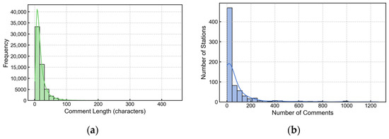Distributional characteristics of the comment dataset. (a) Frequency distribution and density estimation curve of comment length; (b) distribution of the number of comments per station.
