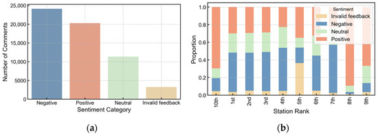 Sentiment distribution analysis. (a) Distribution of sentiment categories across the entire dataset; (b) sentiment category percentages for the 10 stations with the highest number of comments.