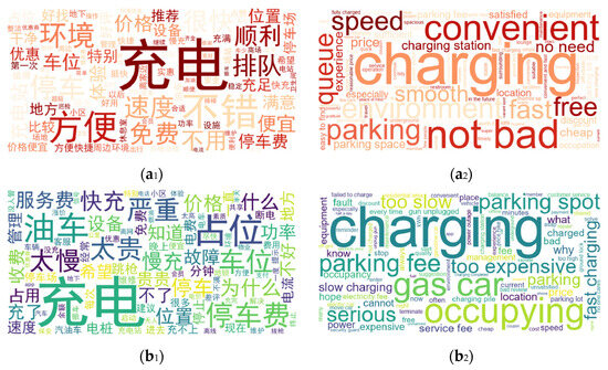 Word frequency word cloud map of commentary affective polarity. (a1) Word frequencies from positive comments in Chinese; (a2) word frequencies from positive comments in English; (b1) word frequencies from negative comments in Chinese; (b2) word frequencies from negative comments in English.