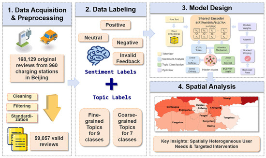 Figure 4 provides a comprehensive overview of our research pipeline, which transforms unstructured user reviews into actionable spatial insights through a four-stage process. The first stage, data collection and pre-processing, begins with the acquisition of 168,129 raw comments from 960 charging stations across Beijing. This dataset undergoes rigorous cleaning, filtering, and standardization to yield 59,057 high-quality, valid reviews. In the second stage, data annotation, we apply a multi-faceted labeling strategy to this refined dataset, assigning each review both sentiment labels (positive, neutral, negative, or invalid feedback) and topic labels at two levels of granularity: fine-grained (nine classes) and coarse-grained (seven classes) [26]. The third stage, model architecture, utilizes these richly annotated data to train classification models based on a unified architecture, which will be detailed in the next subsection. In the final stage, spatial analysis, the structured outputs from the model—predicted sentiments and topics—are integrated with spatial information. This fusion enables spatial analysis of the user experience, including mapping the distribution of sentiment and identifying spatial clusters of specific topics, thereby providing a new dimension of understanding for charging infrastructure management.