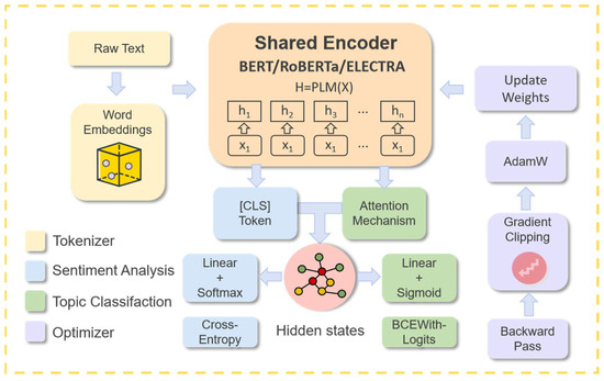 As illustrated in Figure 5, the unified architecture of the model is delineated, encompassing the workflow from data input to model optimization. The process commences with text tokenization, followed by the generation of high-dimensional word embedding vectors. These vectors are then processed by one of three PLMs (BERT, RoBERTa, or ELECTRA) [8,9,11], which act as powerful encoders to generate context-aware hidden state representations for the entire input sequence. From these hidden states, the architecture branches into two independent, task-specific paths [27]. For single-label sentiment analysis, the final hidden state of the special “[CLS]” token is extracted to serve as the sentence-level representation, which is then passed to a linear classifier with a softmax function. For multi-label topic classification, an attention mechanism is first applied to the entire sequence of hidden states to generate a weighted summary vector. This vector is then fed into a linear layer equipped with a sigmoid function. Each path is optimized independently using a corresponding loss function, with cross-entropy for sentiment analysis and binary cross-entropy with logits for topic classification. The training cycle is completed through backpropagation, optional gradient clipping, and the AdamW optimizer, which updates all model weights to improve performance.