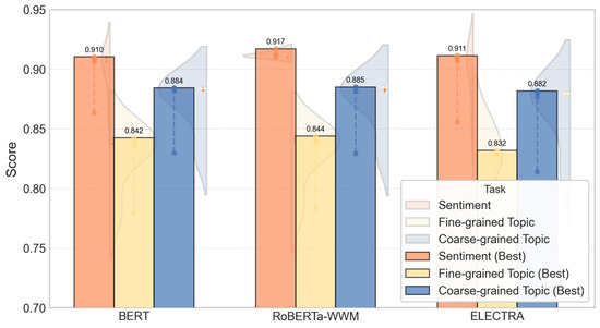 As demonstrated in Figure 6, the models exhibit significantly divergent performance characteristics and task specialization, with no single model configuration proving optimal for all tasks. This underscores the importance of precise calibration for distinct tasks. In terms of optimal performance, RoBERTa-WWM emerges as the leading model, attaining the highest scores across all three tasks. As shown in the charts, it achieves the highest scores in sentiment analysis, fine-grained topic classification, and coarse-grained topic classification. This suggests that the whole-word masking (WWM) pre-training strategy is particularly effective at capturing the diverse semantic features present in user feedback data. While RoBERTa-WWM demonstrated the highest peak performance, the violin plot offers a more comprehensive perspective on performance distribution. BERT demonstrated robust and consistent performance, particularly in topic classification. ELECTRA also consistently achieved high scores in the sentiment analysis task. The exceptional performance of RoBERTa-WWM, when combined with varied optimal configurations for different tasks, indicates a key finding: although strong pre-training objectives, like WWM, provide a robust foundation, fully realizing a model’s potential requires targeted optimizations based on the specific architectural and feature requirements of the downstream task.