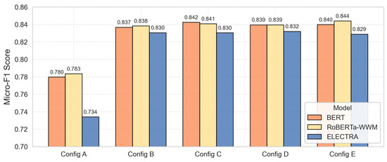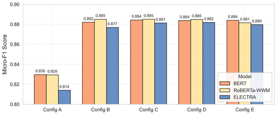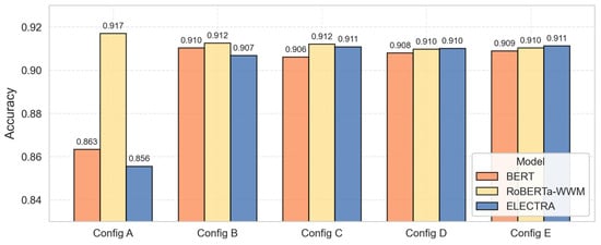 Figure 7 illustrates the performance (accuracy) of the three models on the sentiment analysis task across five distinct hyperparameter configurations. The results reveal several key insights into the models’ characteristics. RoBERTa-WWM demonstrates exceptional out-of-the-box capability, achieving the overall highest score (0.917) in the baseline Configuration A. This suggests that its pre-training with WWM makes it inherently well-suited for sentiment analysis. In contrast, ELECTRA starts with the lowest baseline performance (0.856) but exhibits the greatest potential for improvement. Through hyperparameter tuning, its accuracy climbs by 5.5 percentage points to a competitive peak of 0.911 (Configurations C and E), underscoring that its potential is fully unlocked with sufficient adaptation to the downstream task. BERT shows a solid baseline and benefits moderately from tuning, reaching its peak performance of 0.910 in Configuration B. Furthermore, the effectiveness of tuning strategies varies by model. Configuration D, which adjusts task loss weights, fails to yield the best result for any model, suggesting that direct manipulation of task-specific loss may be a less effective optimization route. Instead, strategies, such as increasing the input sequence length (Configuration C) or extending the training cycle (Configuration E), proved more effective, particularly for unlocking ELECTRA’s performance. This reinforces the conclusion that optimal model performance is not achieved through a one-size-fits-all approach but requires targeted tuning tailored to the specific pre-training architecture and task.